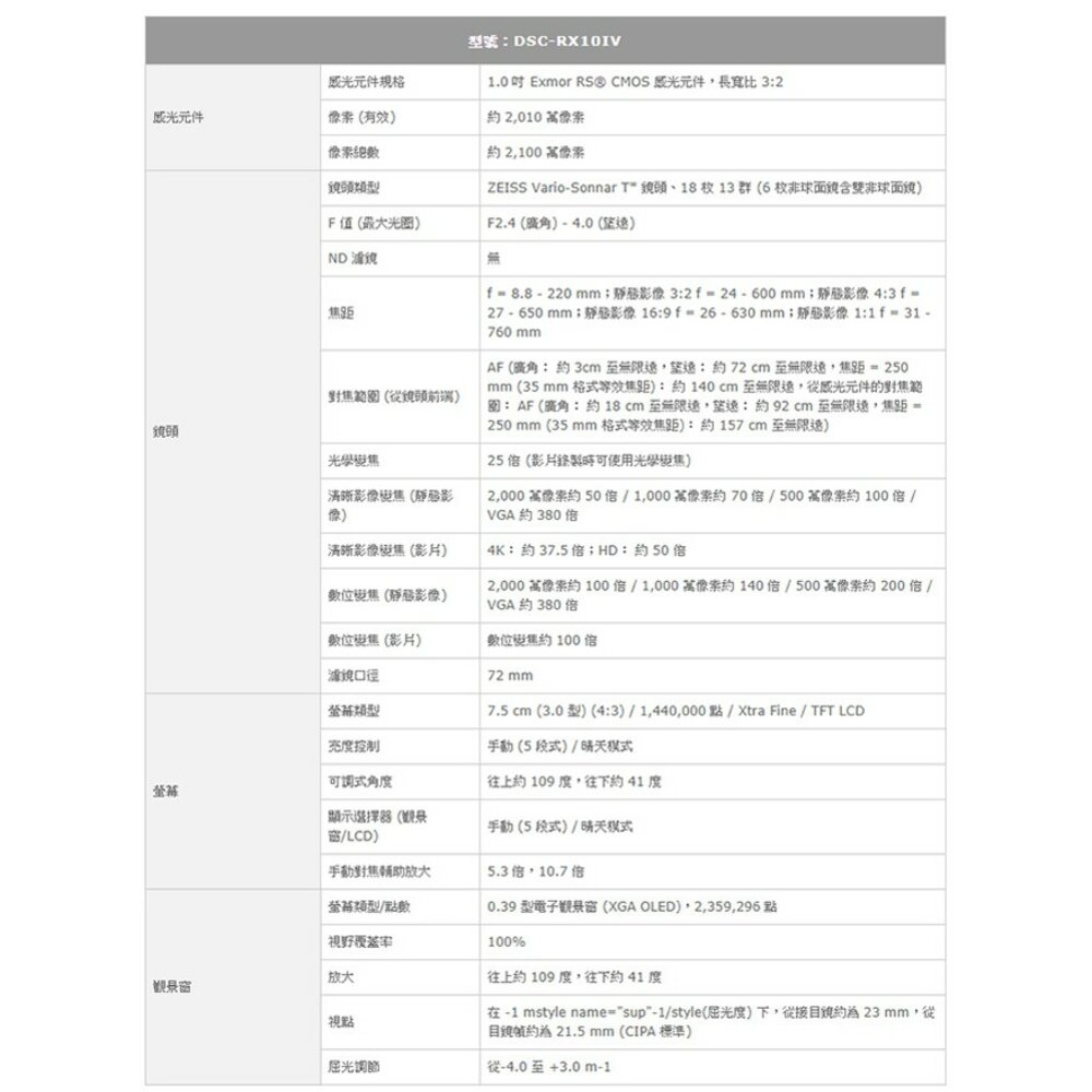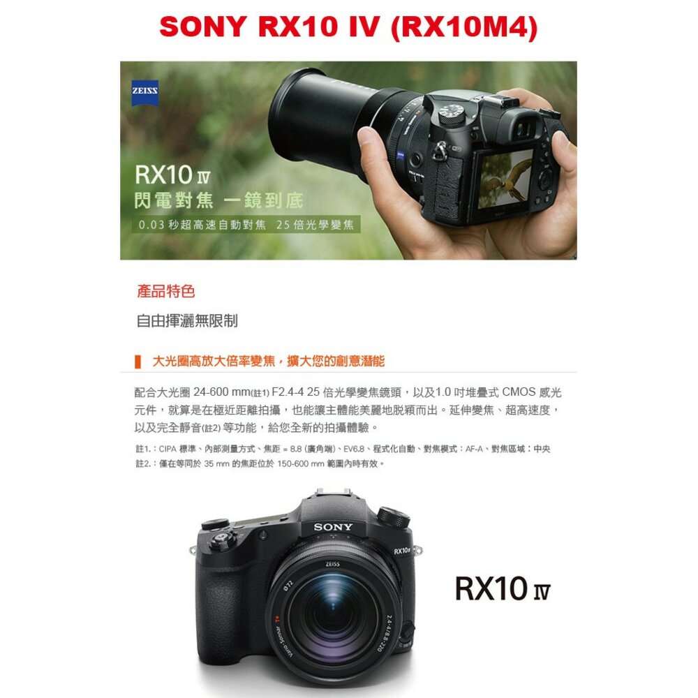 除新品不良可協助檢測換新,一經拆封恕無法接受退換貨 SONY DSC-RX10M4 4K高畫質專業相機 二年保固 贈專用電池座充組+128G記憶卡 平輸中文