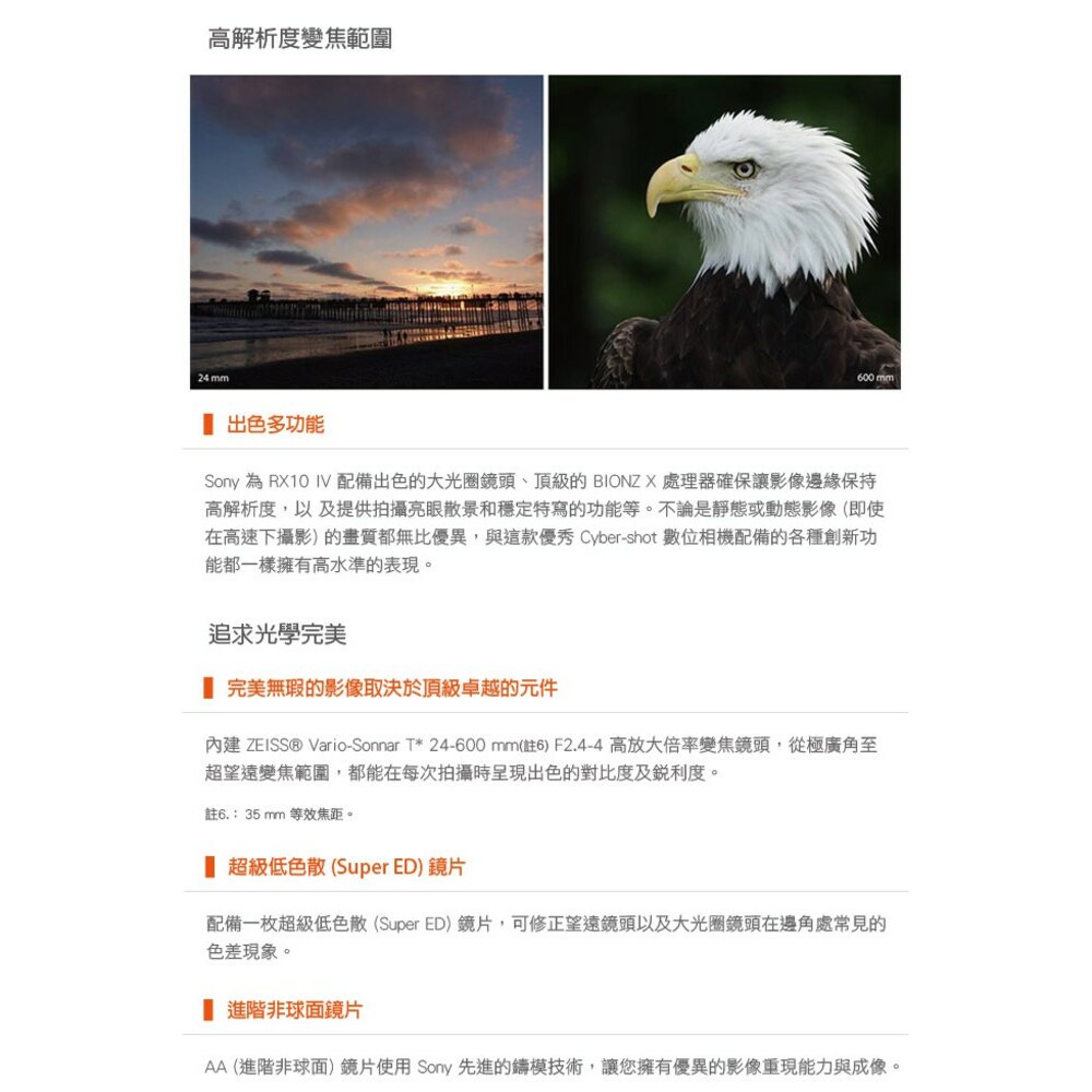 Sony 為 RX10 IV 配備出色的大光圈鏡頭、頂級的 BIONZ X 處理器確保讓影像邊緣保持高解析度,以及提供拍攝亮眼散景和穩定特寫的功能等。不論是靜態或動態影像 (即使在高速下攝影) 的畫質都無比優異,與這款優秀 Cyber-shot 數位相機配備的各種創新功能都一樣擁有高水準的表現。