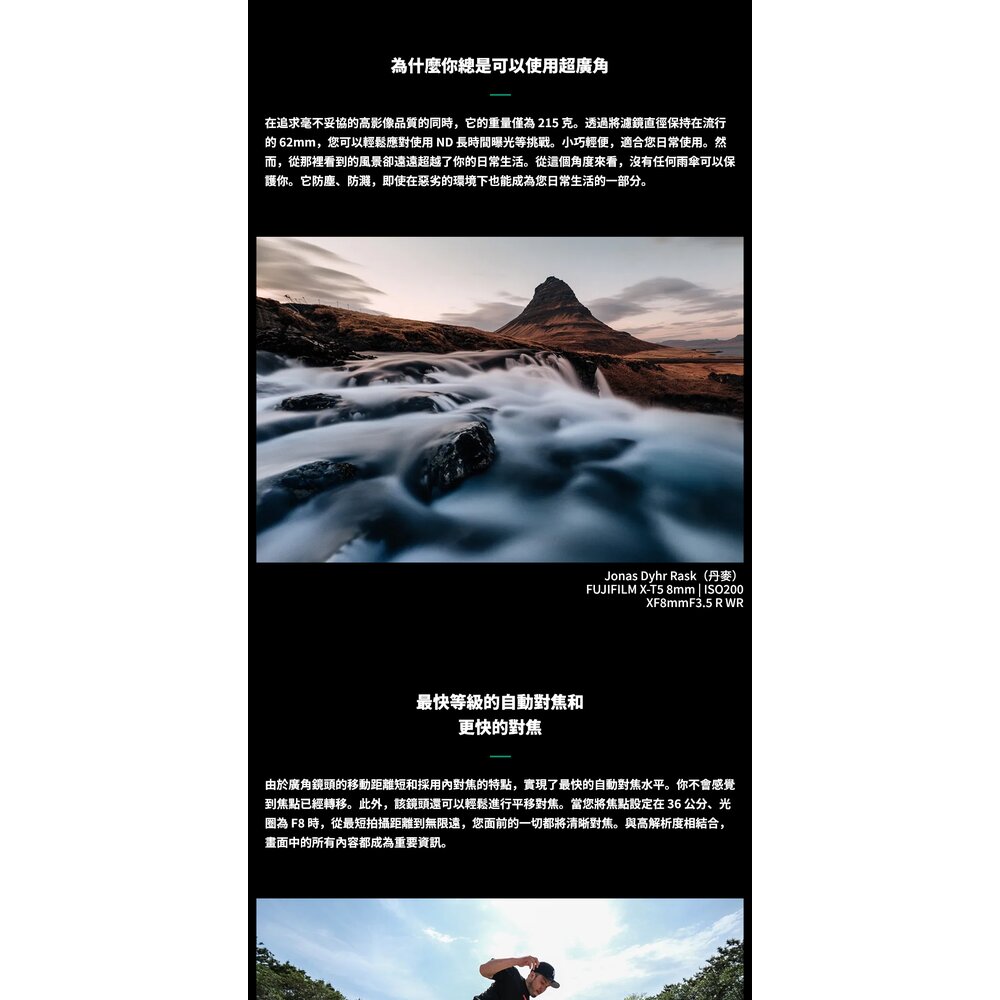 🎯 商品簡介 挑戰視野的極限!這款 FUJIFILM XF 8mm F3.5 R WR 提供了等效 12mm 的超廣視角,是富士 XF 系列中視角最廣的非魚眼定焦鏡。重量僅 215g 的極致輕巧設計,使其成為風景攝影、建築紀錄及 Vlogging 的絕佳夥伴。具備 WR 全天候防滴防塵性能,無論在何種嚴苛環境下,都能穩定捕捉震撼人心的高畫質影像。
