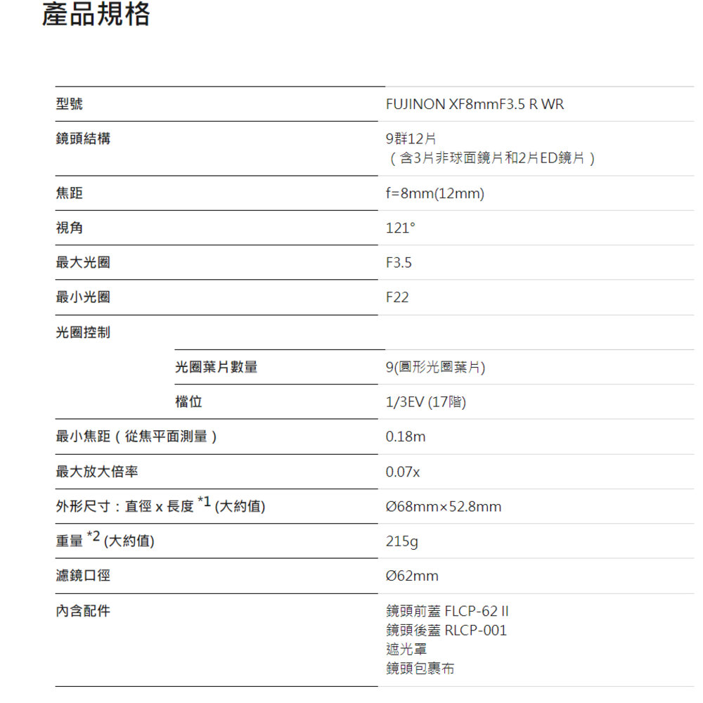 焦距範圍: 8mm (等效 35mm 格式之 12mm) 最大光圈: F3.5 濾鏡尺寸: 62mm (超廣角鏡頭中極為罕見的濾鏡通用性) 最近對焦: 0.19m 鏡頭防護: WR 防滴防塵結構,-10°C 耐低溫設計 重量尺寸: 約 215g / 長度 52.8mm 適用機型: X-T5、X-T4、X-H2S、X-S20 等全系列 X 接環相機 商品來源: 恆昶公司貨,享有原廠保固服務