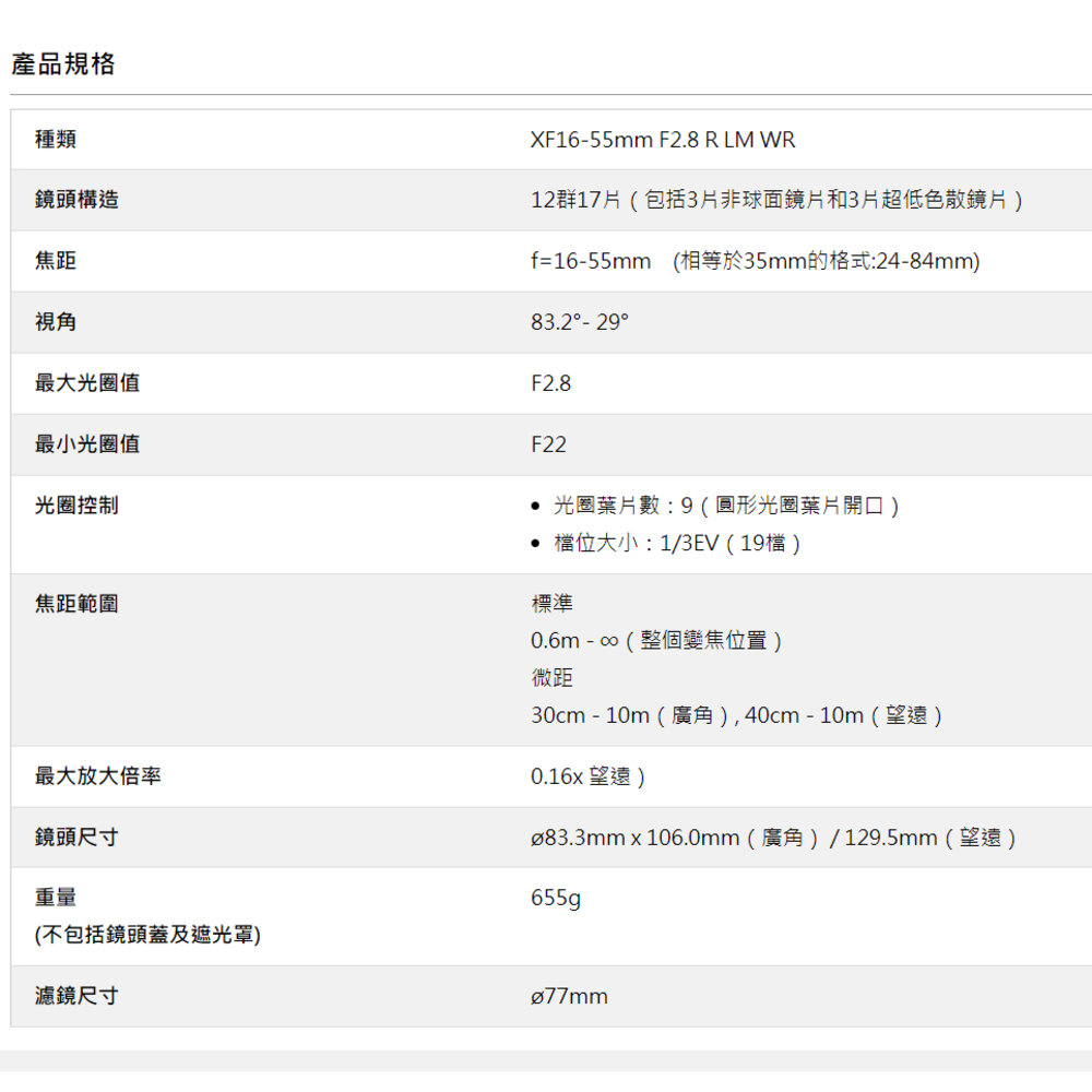 全天候的變焦鏡頭XF16-55mm F2.8 R LM WR是一款旗艦型“XF標準變焦鏡頭”,具有相當於24mm*至84mm*的焦距,並且在整個變焦範圍內具有固定的F2.8大光圈。優良的光學設計可控制各種形式的色差問題,可在整個變焦範圍內實現清晰的影像品質。