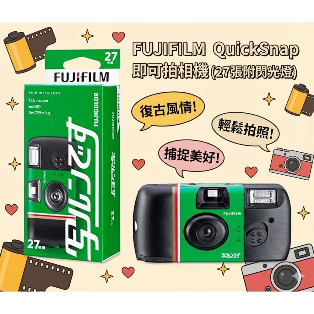 💡【常見 Q&A】 Q:這個可以重複使用嗎? A:不行喔!這是一次性即可拍,拍完 27 張後,請整台相機交給照相館沖洗底片。