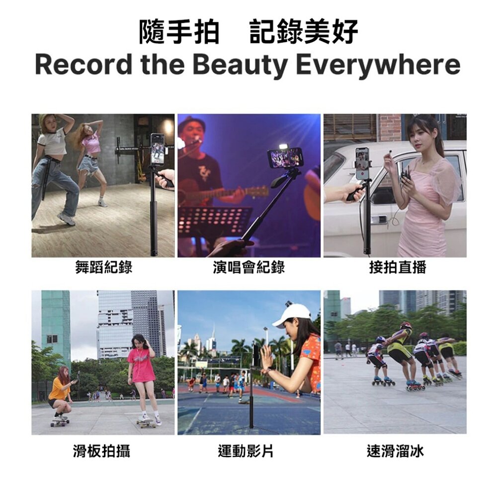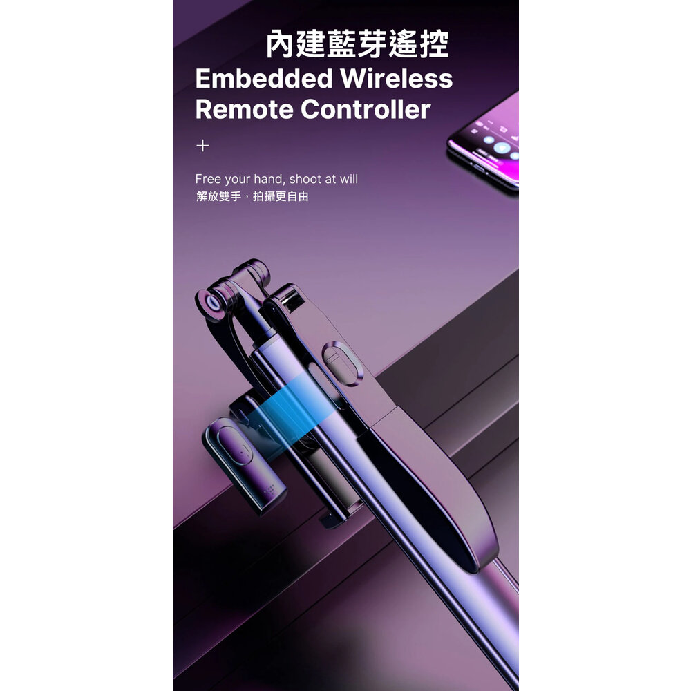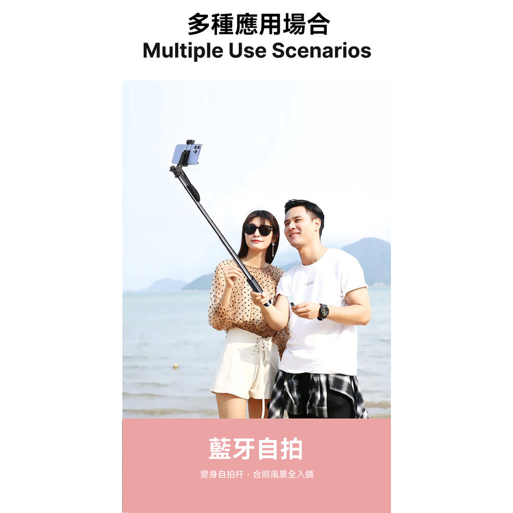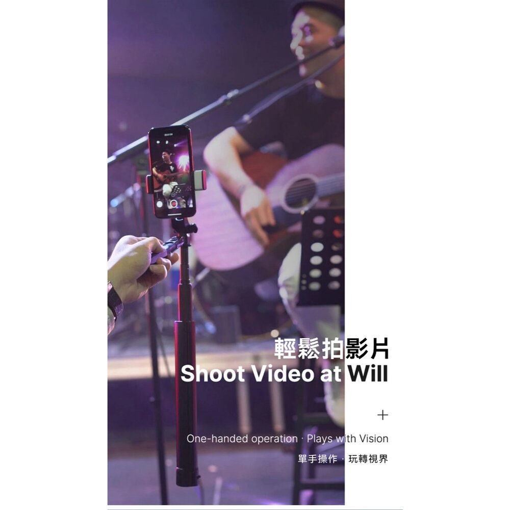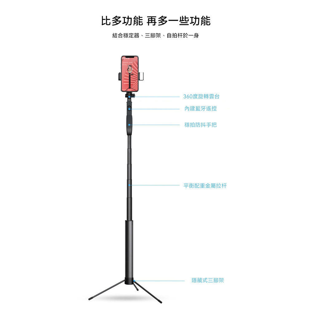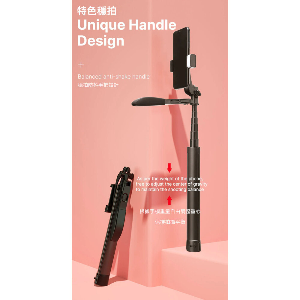 - 一體式設計,結合穩定、藍牙、自拍杆於一身