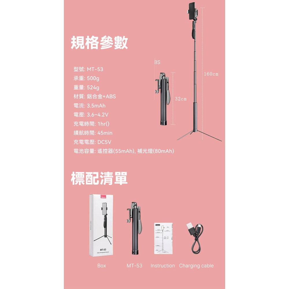 Ulanzi MT-53 手持防抖 三腳架自拍杆 / 鋁合金 / 最大高度160cm
