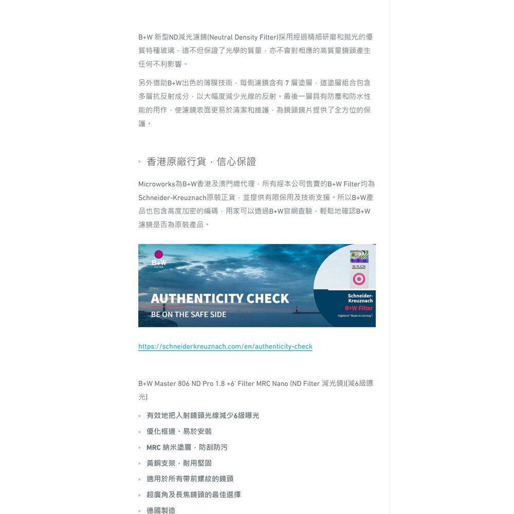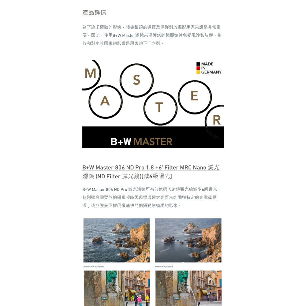 B+W Master 806 ND Pro 1.8 +6' Filter MRC Nano (ND Filter 減光鏡)[減6級曝光]