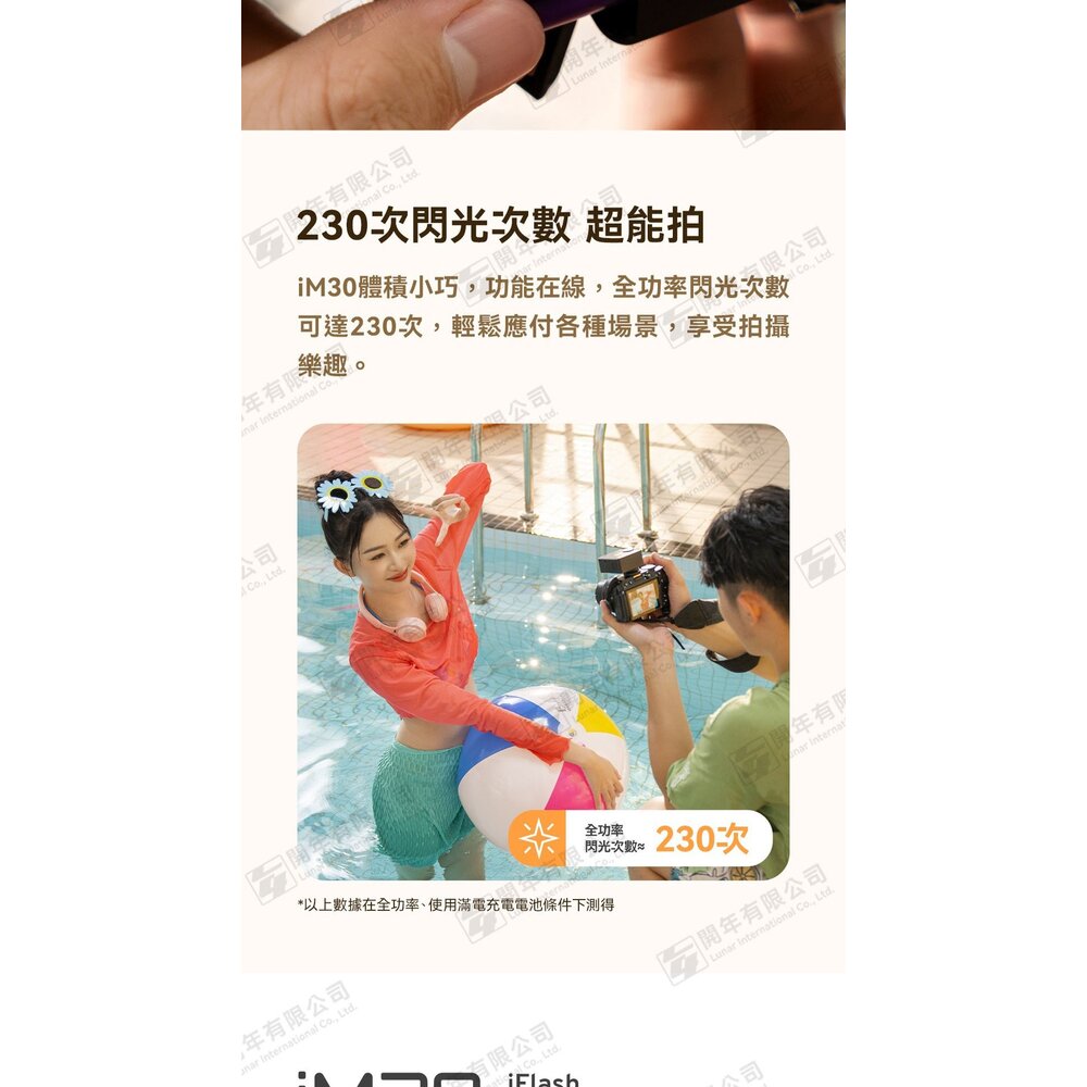 iM30體積小巧,功能在線,全功率閃光次數可達230次,輕鬆應付各種場景,享受拍攝樂趣。