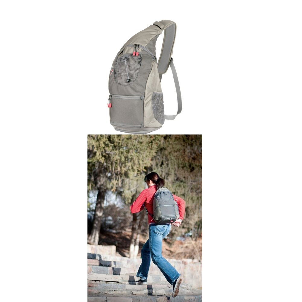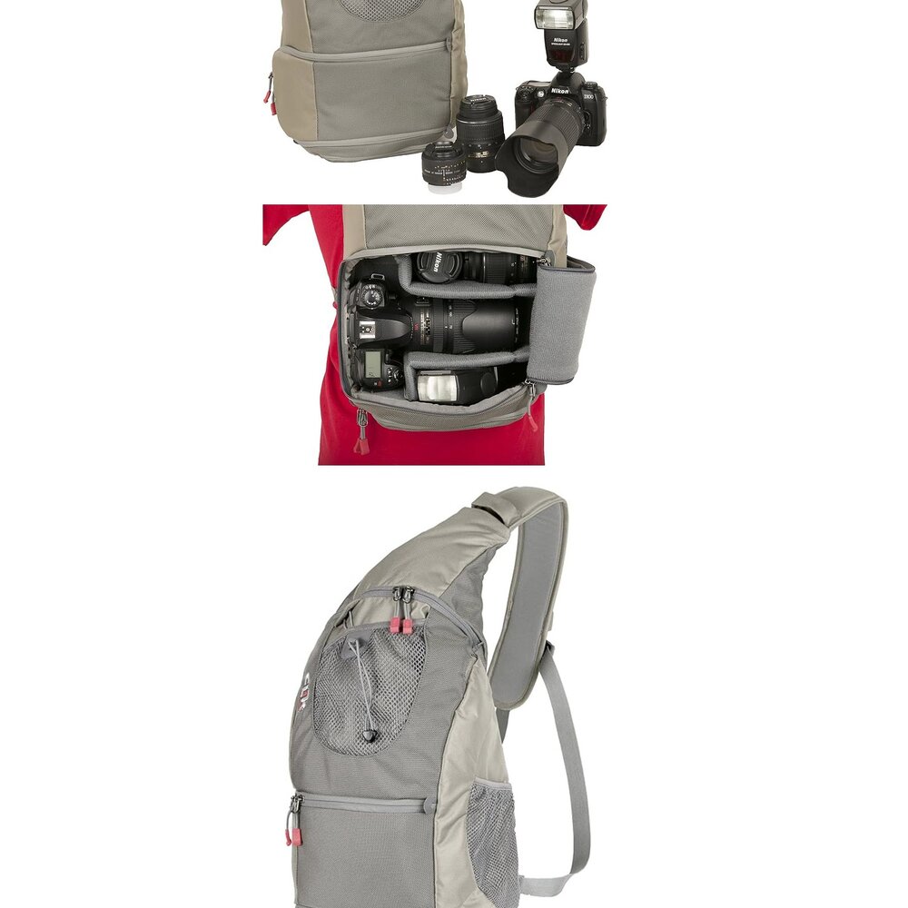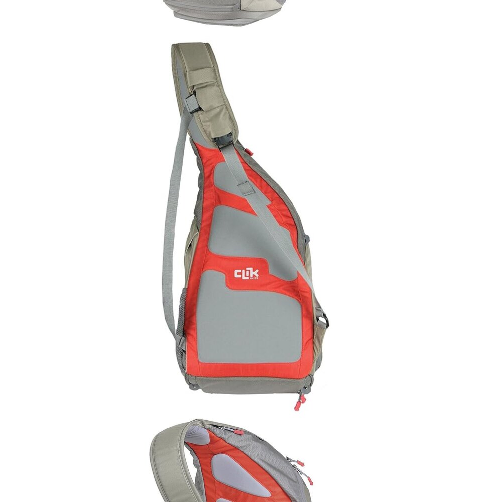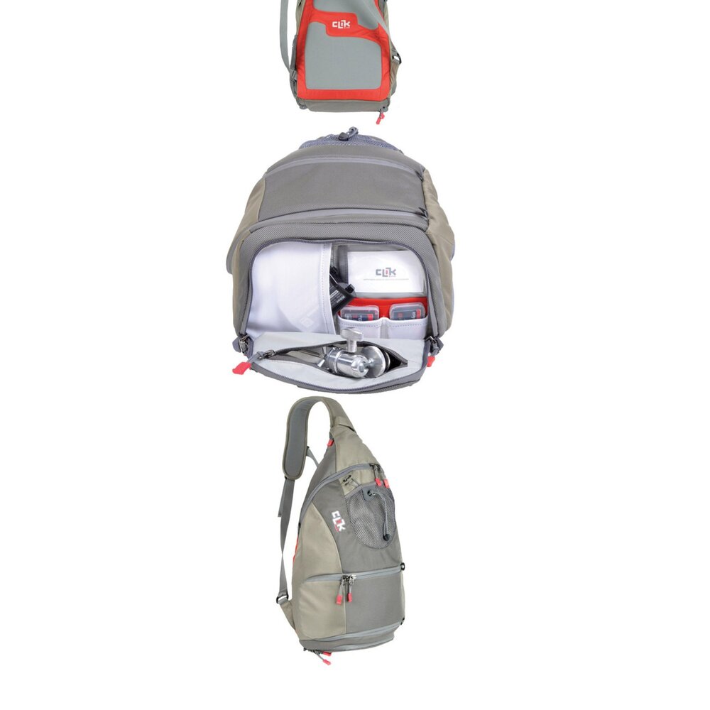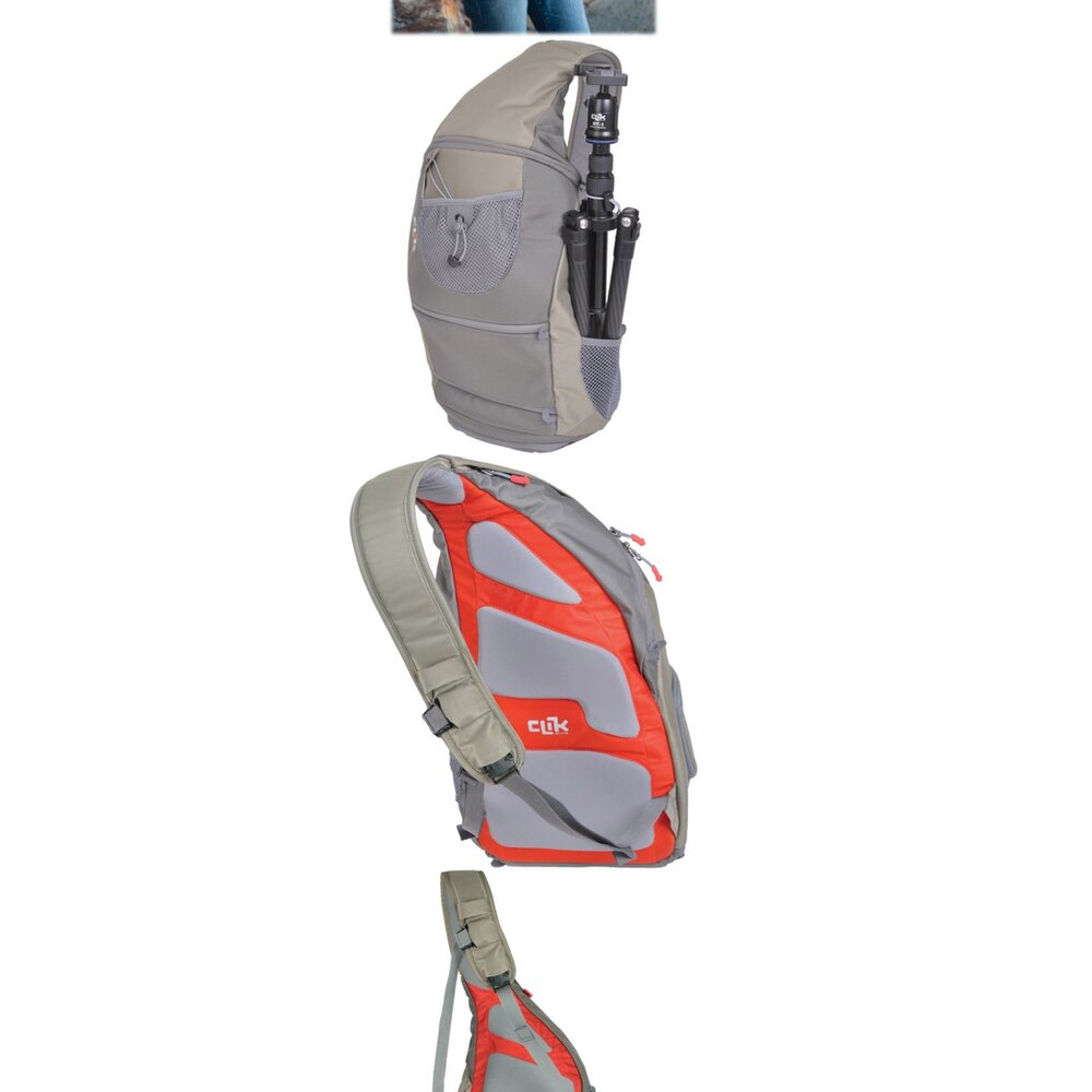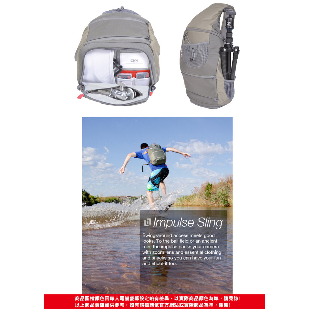 Clik Elite的灰色Impulse Sling擁有一個全襯墊的 約6公升相機置放空間,採用模組化結構,旨在攜帶帶有變焦鏡頭和配件的數位單眼相機。該包由 1680丹尼龍製成,配有 420丹高韌性尼龍飾邊,全襯裡,並配有成品接縫。它有一個約 7.0 公升的頂部隔層,可容納長時間戶外活動或在城鎮休閒的一天所需的大量必需品,還有一個帶拉鍊的電子產品和太陽眼鏡隔間。