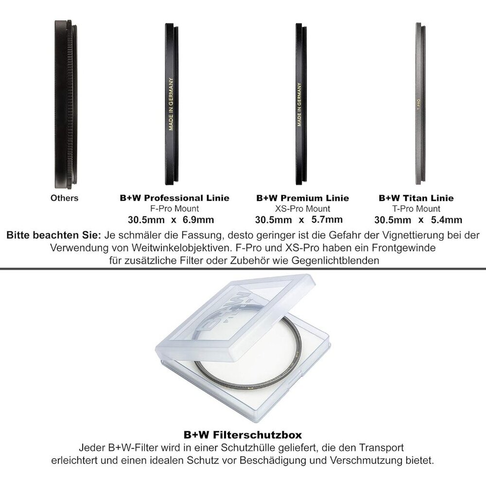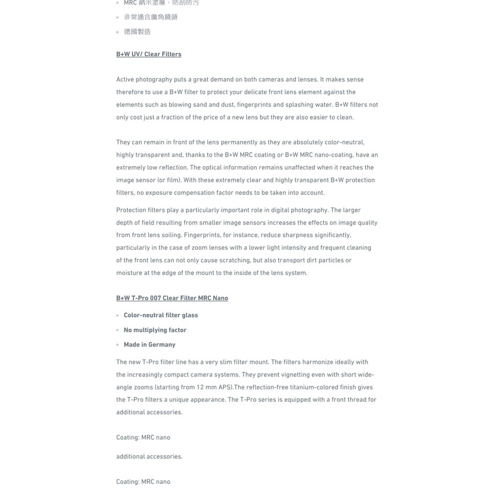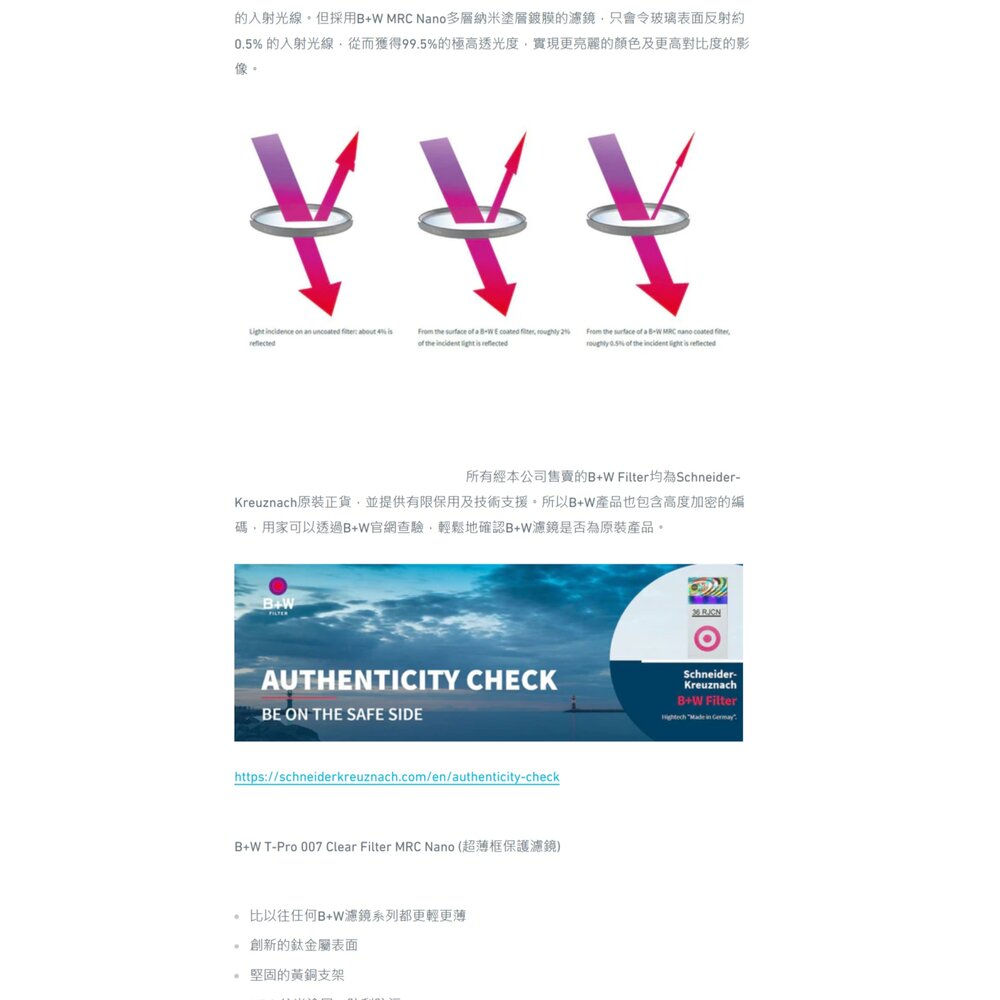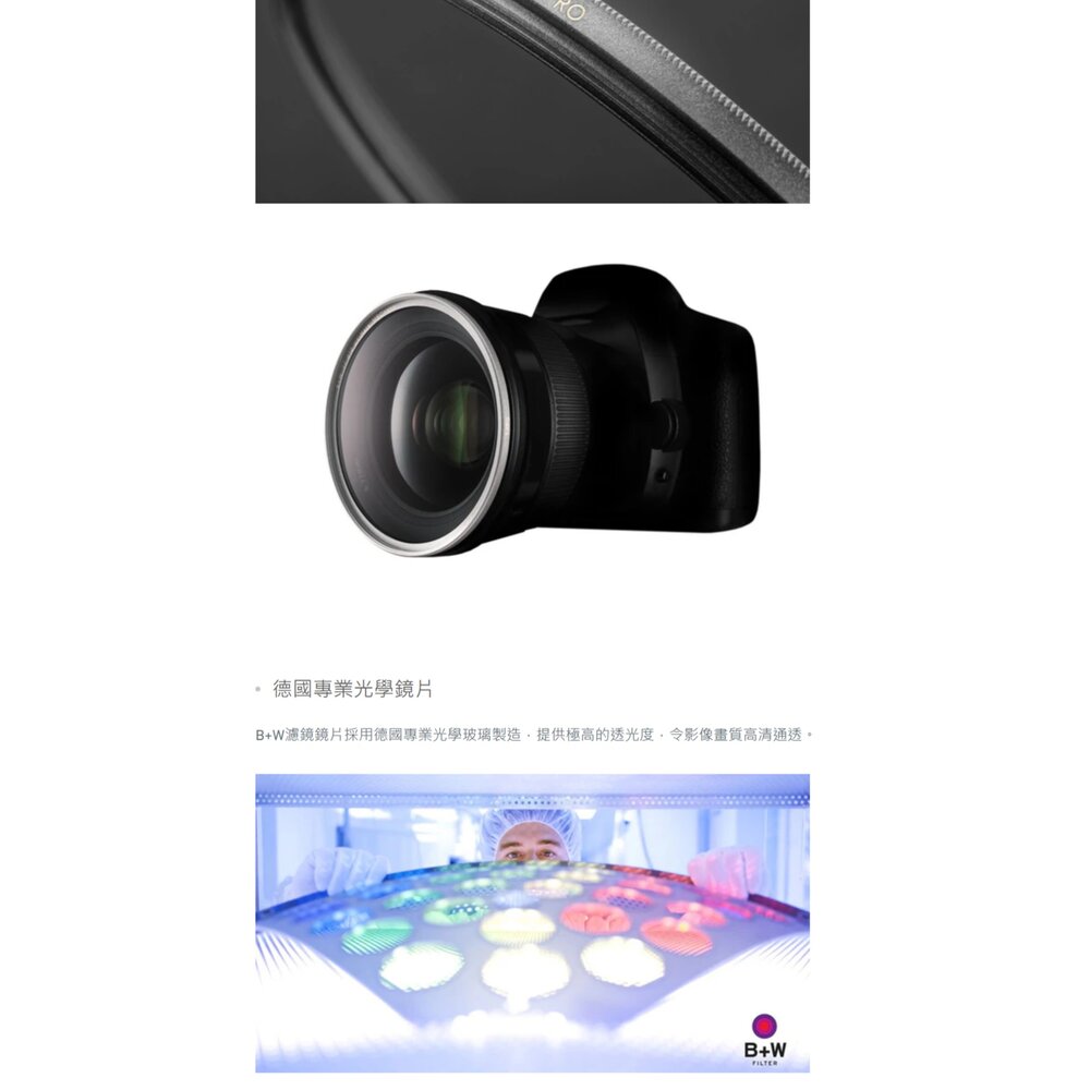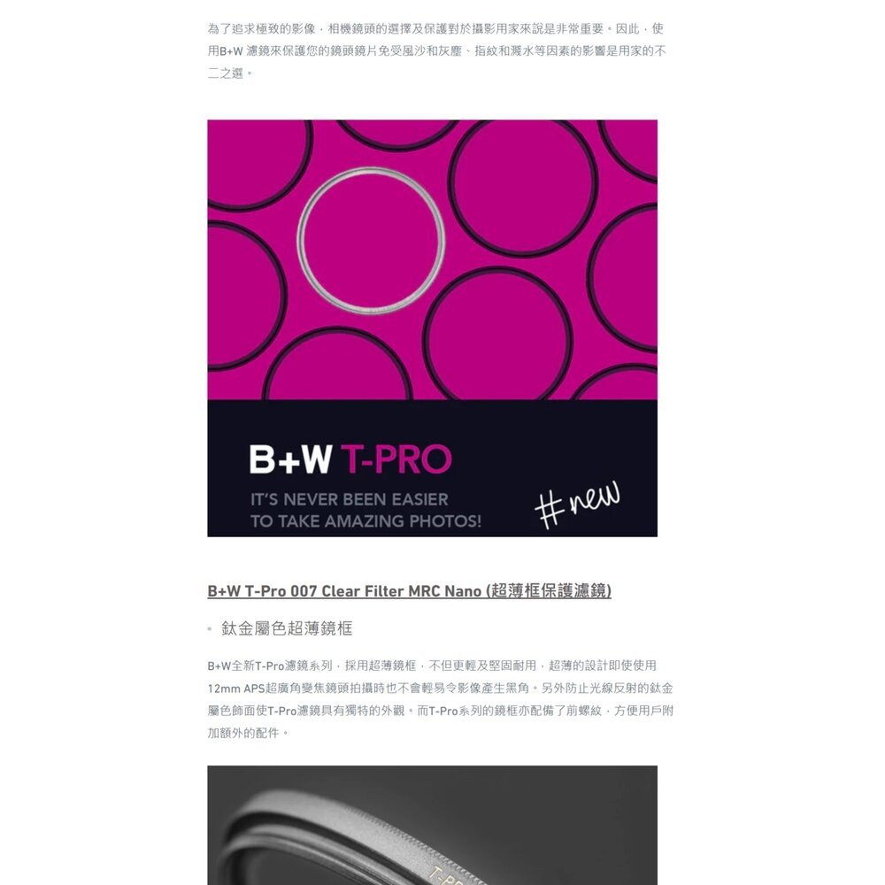 🎯 商品簡介 頂級光學的守護者!來自德國的 B+W T-PRO 系列,採用全新研發的超薄鈦色框架,大幅降低廣角鏡頭產生暗角的機率。搭載經典 007 Clear 透明濾鏡與 MRC nano 多層奈米鍍膜,具備高透光率、抗靜電且防污防潑水,能為您的昂貴鏡頭提供最純淨且堅固的保護。本商品支持官方驗證,確保正品品質!