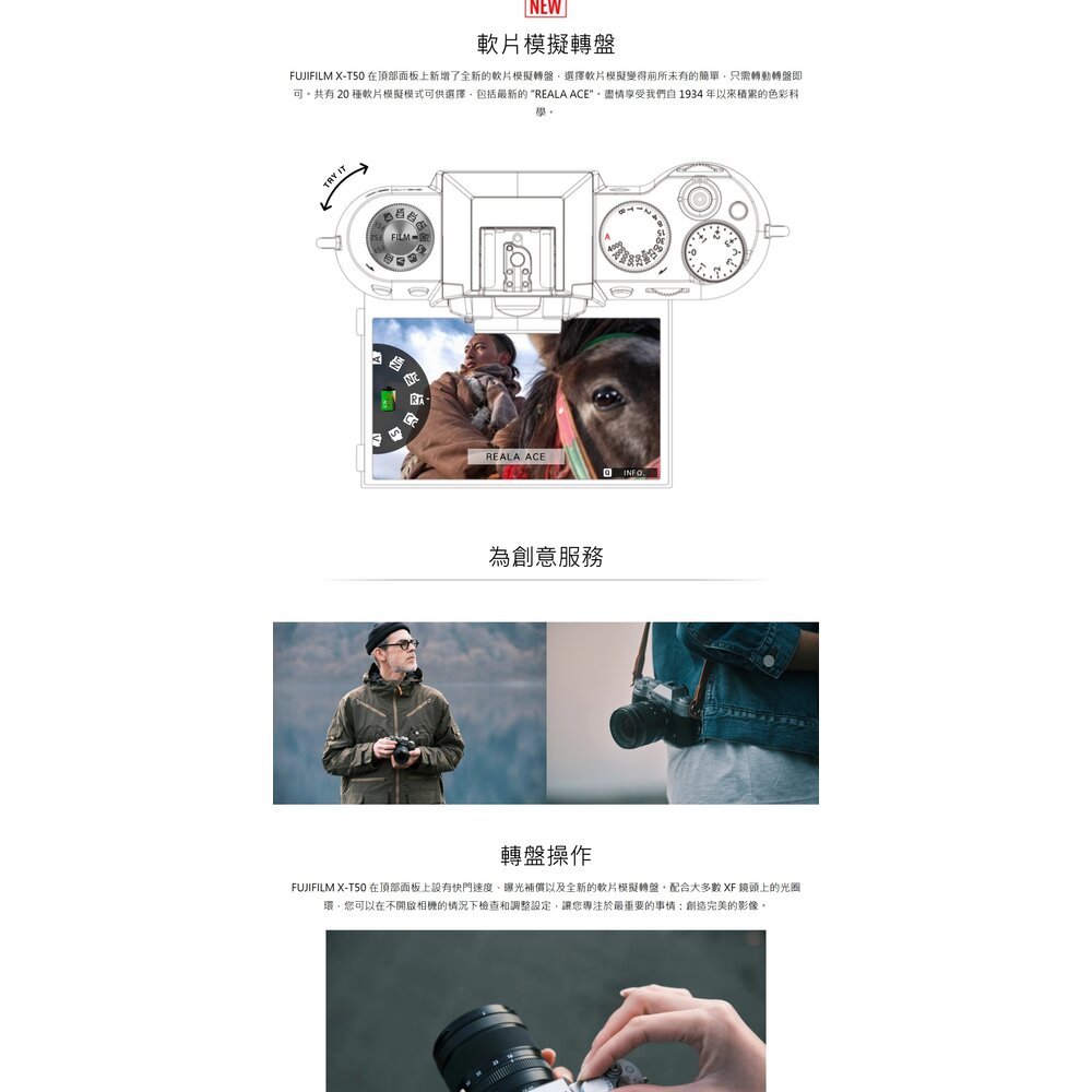 🆕 獨家膠卷模擬轉盤: X-T50 首創機頂專用轉盤,一鍵切換多種經典底片色調,直出美照無需後製。