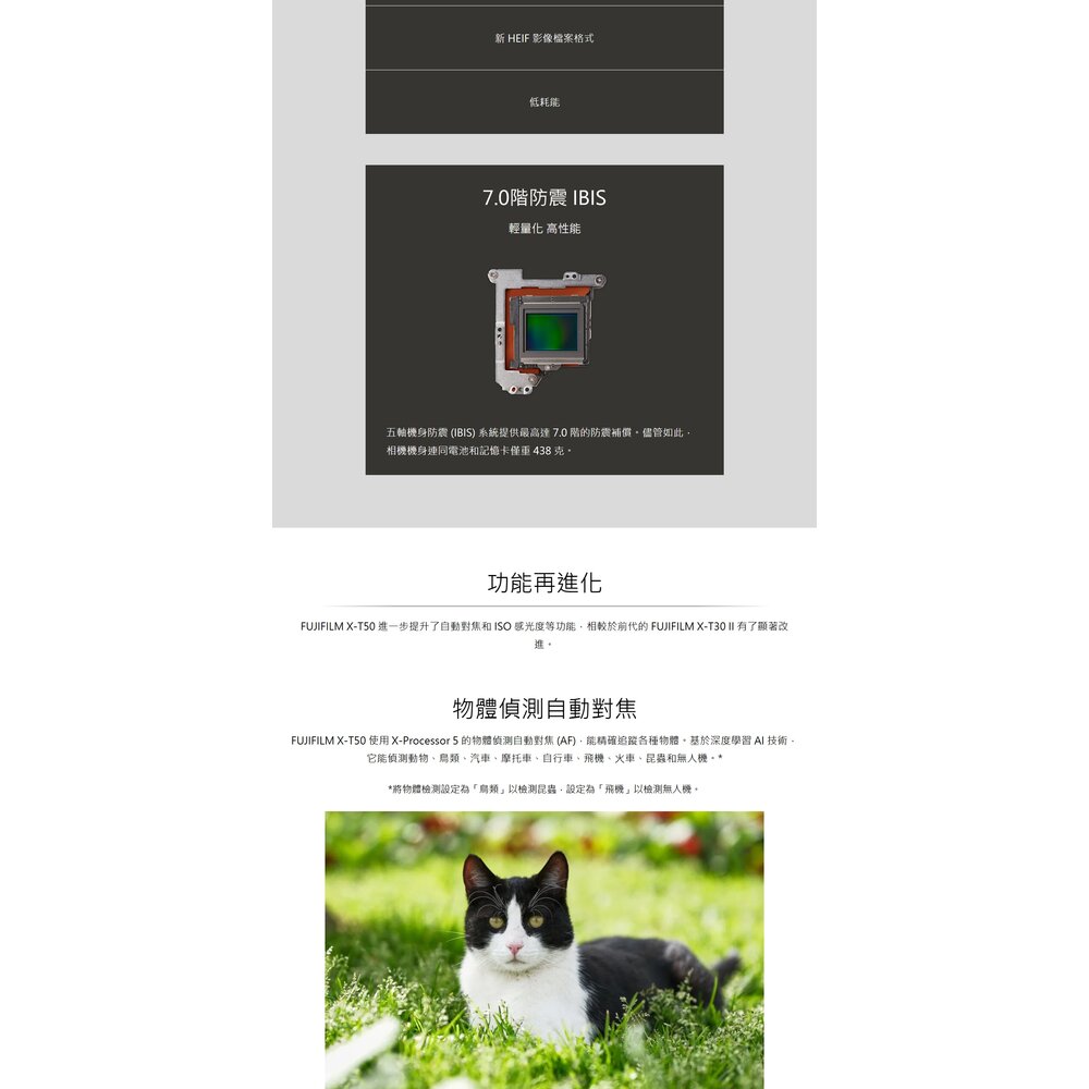 FUJIFILM X-T50 使用 X-Processor 5 的物體偵測自動對焦 (AF),能精確追蹤各種物體。基於深度學習 AI 技術,它能偵測動物、鳥類、汽車、摩托車、自行車、飛機、火車、昆蟲和無人機。*