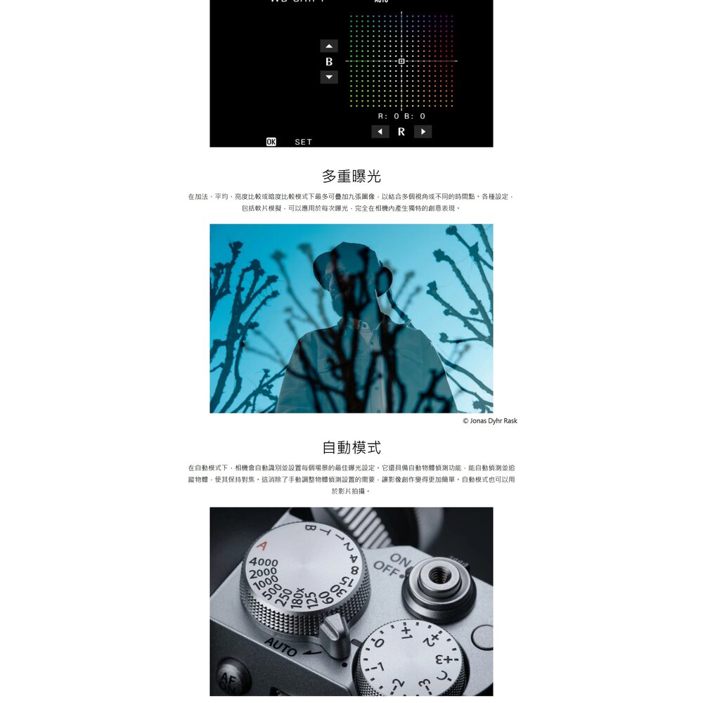 在加法、平均、亮度比較或暗度比較模式下最多可疊加九張圖像,以結合多個視角或不同的時間點。各種設定,包括軟片模擬,可以應用於每次曝光,完全在相機內產生獨特的創意表現。