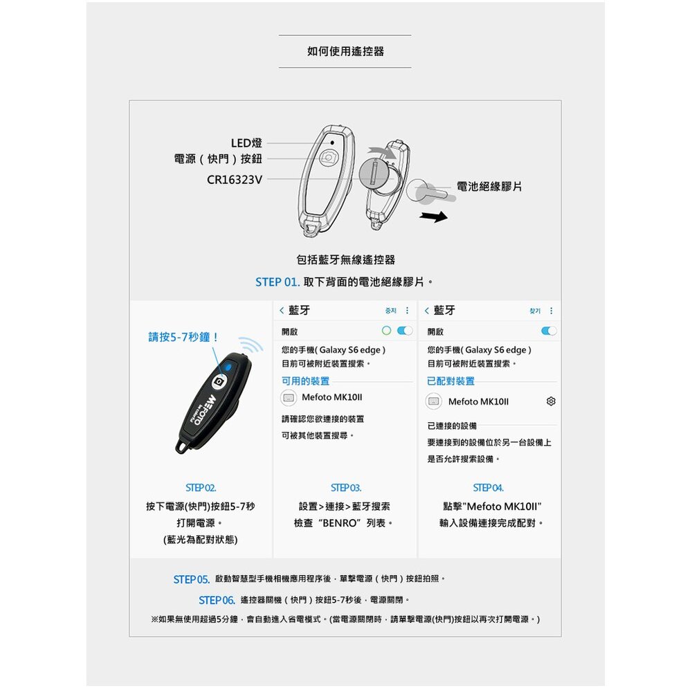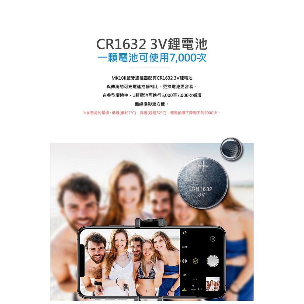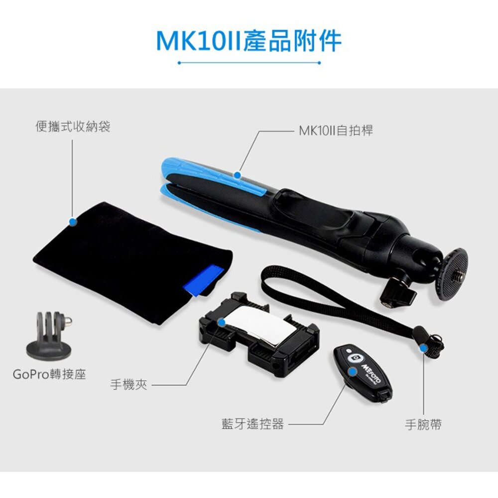 【自拍直播 ‧ 一桿搞定】 MEFOTO MK10II 二代進化登場!這不僅是一支藍牙自拍棒,更是穩定的桌上型腳架。內建可充電式藍牙遙控器,支援長距離遙控拍攝。具備標準 1/4 螺牙及專用手機夾,相容手機、GoPro 及小型相機,輕巧設計讓您無論是旅行自拍、視訊直播或縮時攝影都能輕鬆應對。