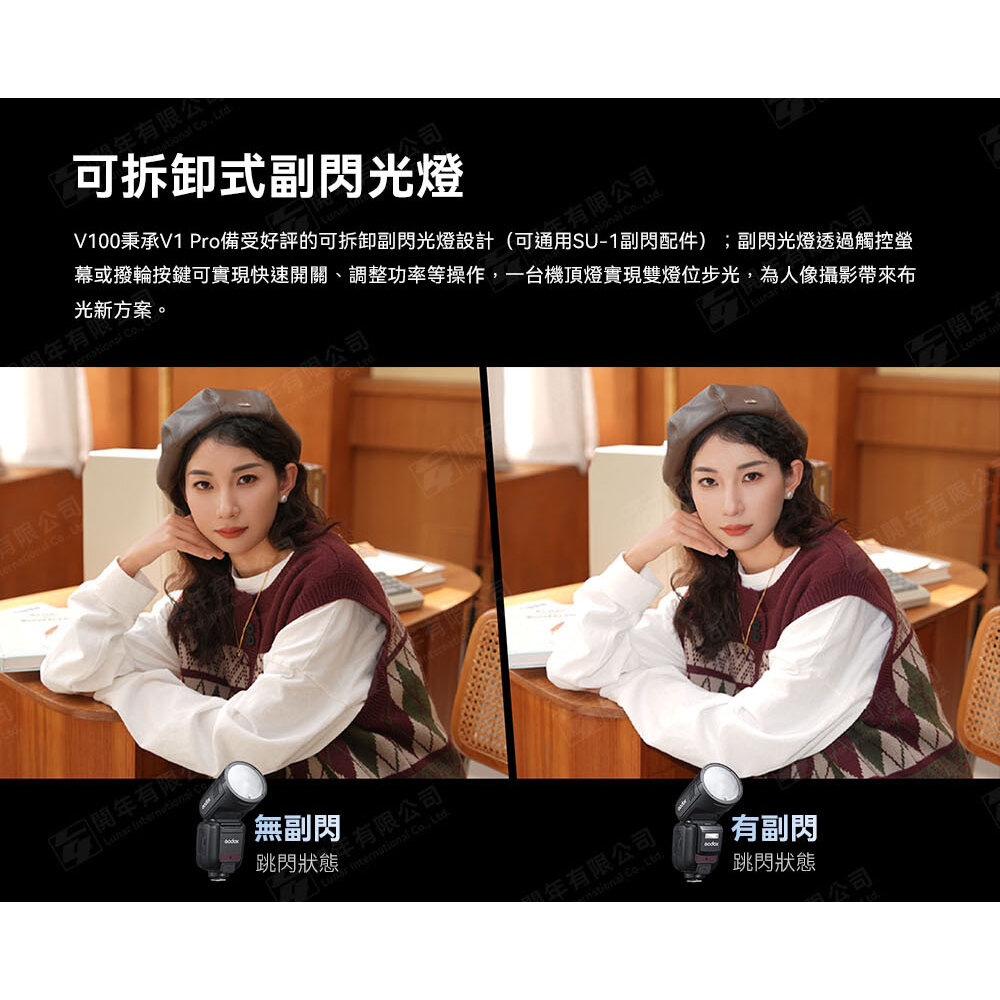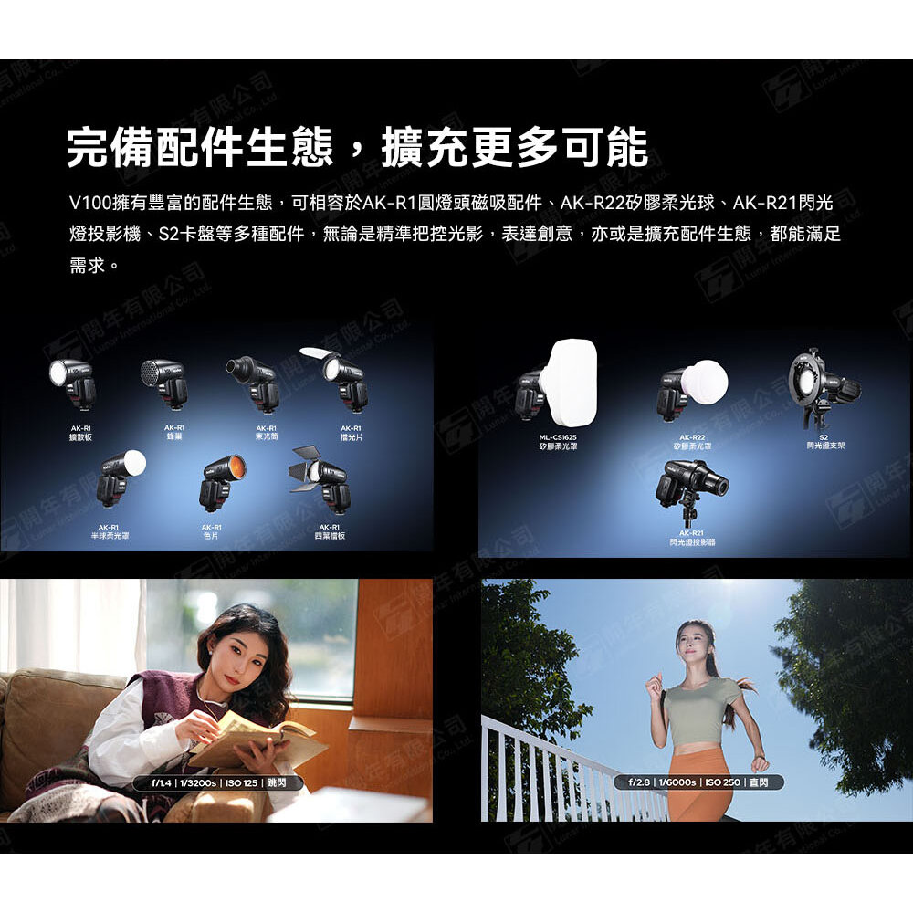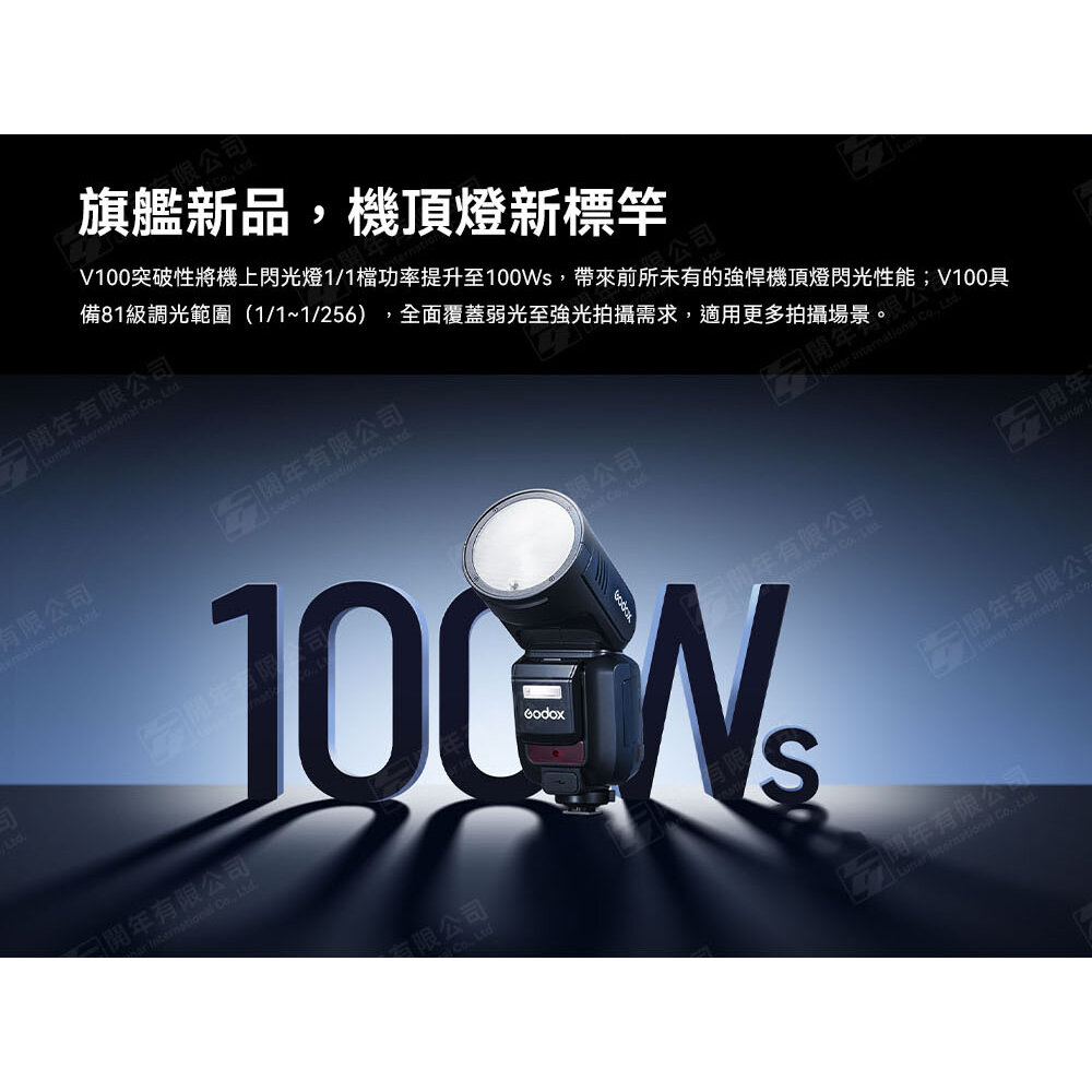 .V100突破性將機上閃光燈1/1檔功率提升至100Ws,帶來前所未有的強悍機頂燈閃光性能;具備81級調光範圍(1/1~1/256),全面覆蓋弱光至強光拍攝需求