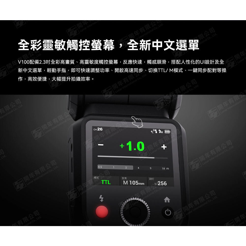 配備2.3吋全彩高畫質、高靈敏度觸控螢幕,反應快速,觸感順滑,搭配人性化的UI設計及全新中文選單,可快速調整功率、開啟高速同步、切換TTL/ M模式、一鍵同步配對等操作