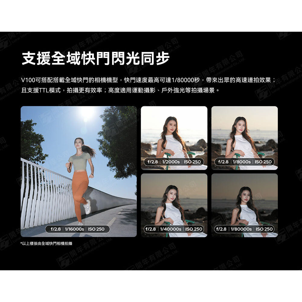 可搭配全域快門的相機機型,快門速度最高可達1/80000秒;且支援TTL模式,拍攝更有效率