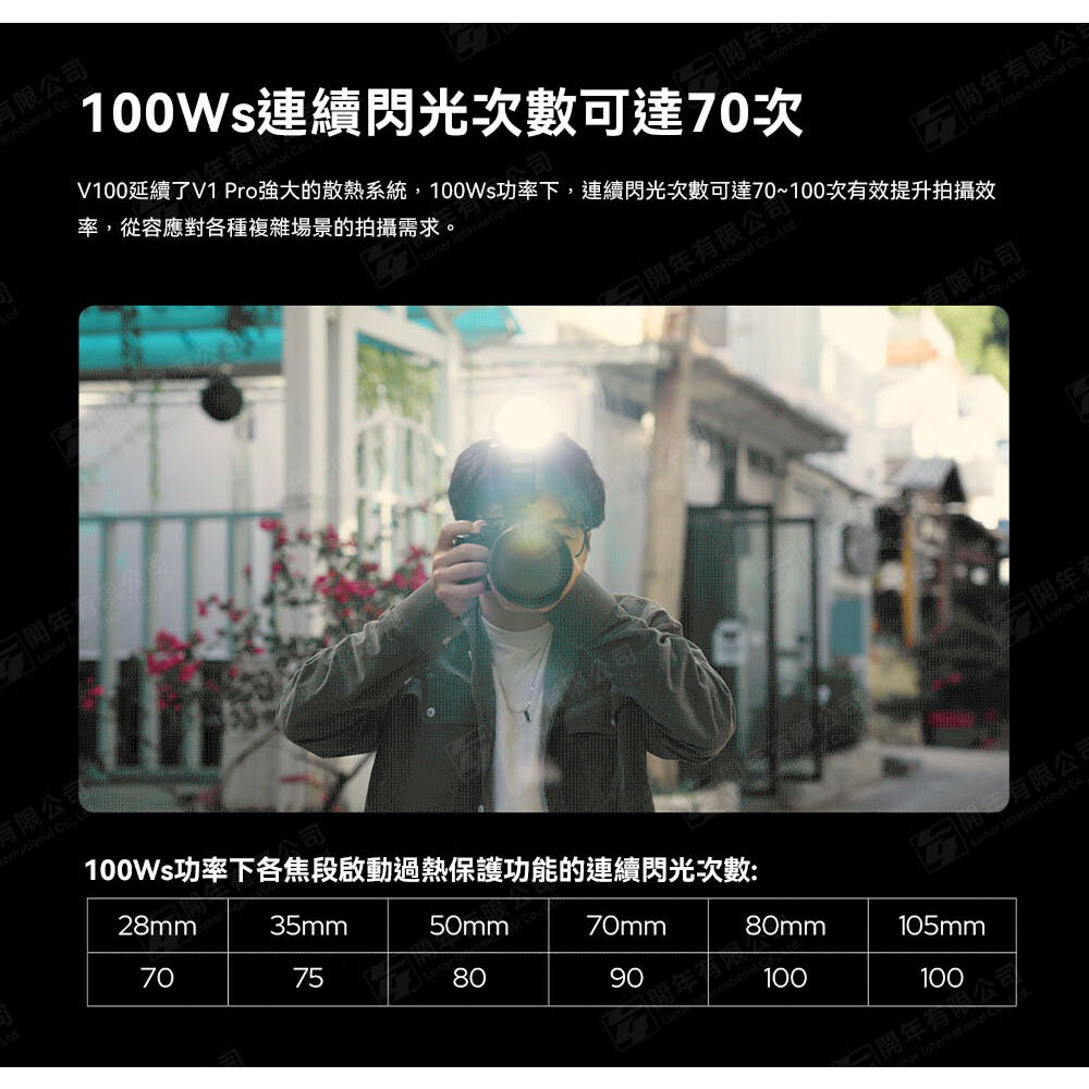 100Ws功率下,連續閃光次數可達70~100次有效提升拍攝效率,從容應對各種複雜場景的拍攝需求