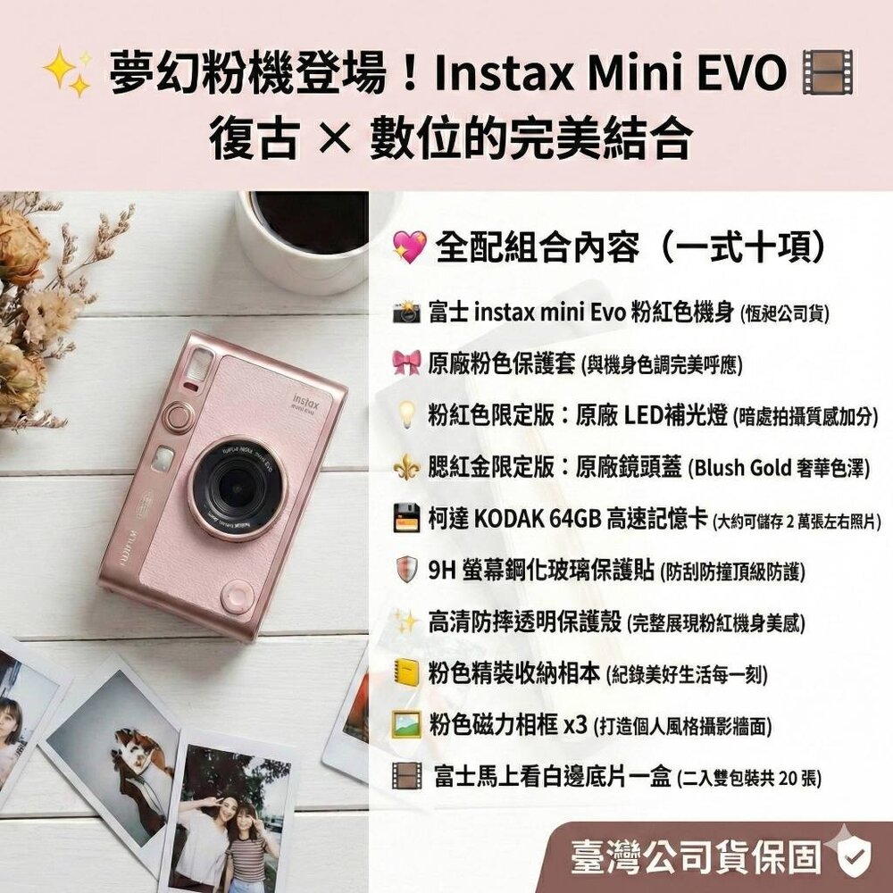 🎯 商品簡介 甜美與奢華的極致邂逅!這款 instax mini Evo 粉紅色 全新色調正式登場。本組合專為追求一體化美學的玩家設計,精心挑選 【粉紅限定配件全配組】。除了專用的粉色系皮革套與粉紅限定補光燈,更搭配了質感卓越的 腮紅金 (Blush Gold) 限定版金屬鏡頭蓋。具備 100 種影像表現與手機相印機功能,搭配超大容量記憶卡與雙包裝底片,讓您一次擁有最完整的夢幻攝影體驗。