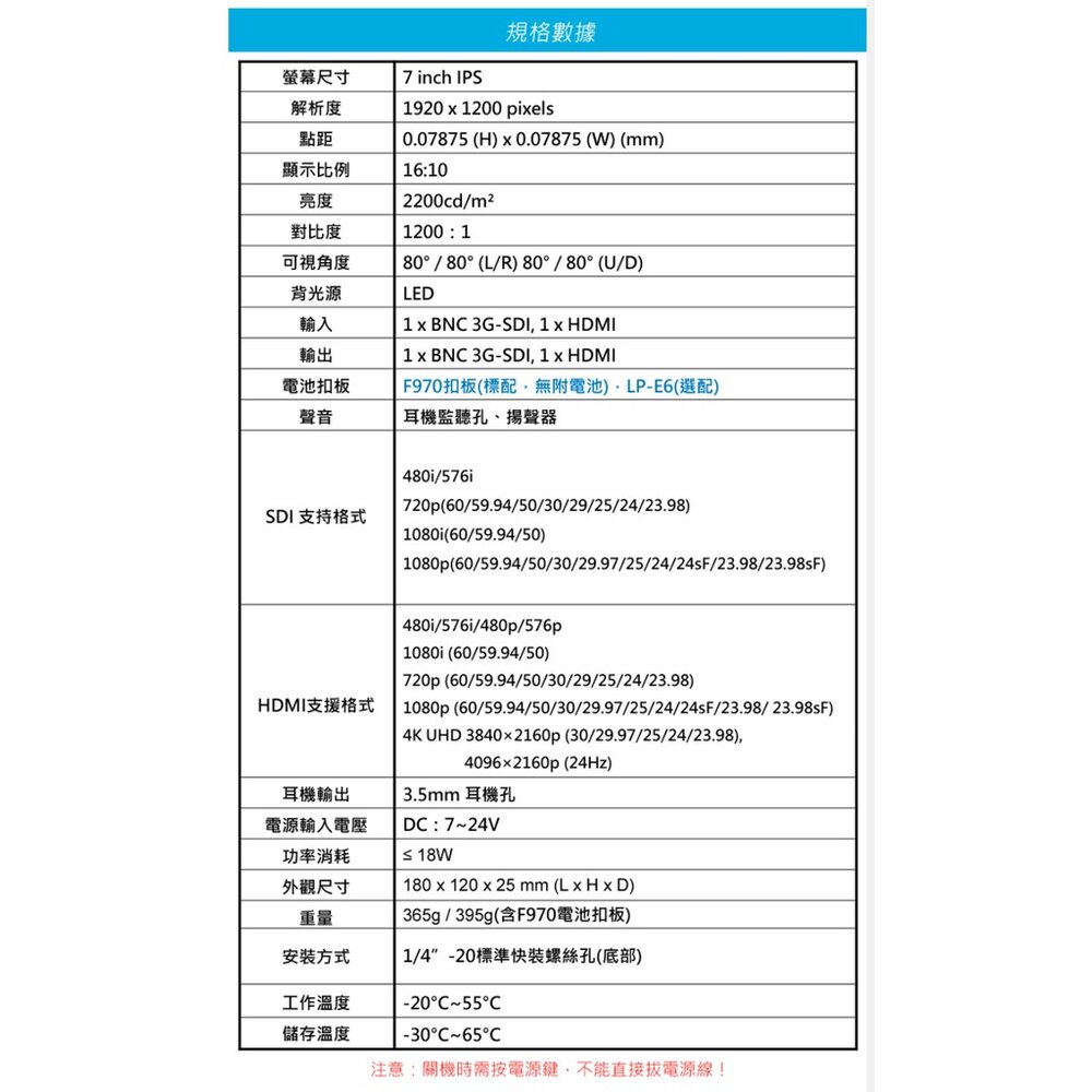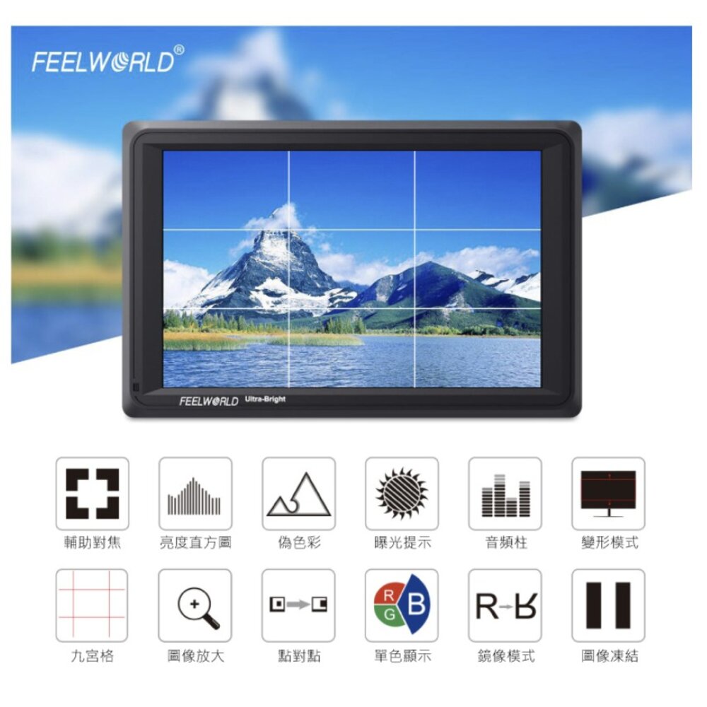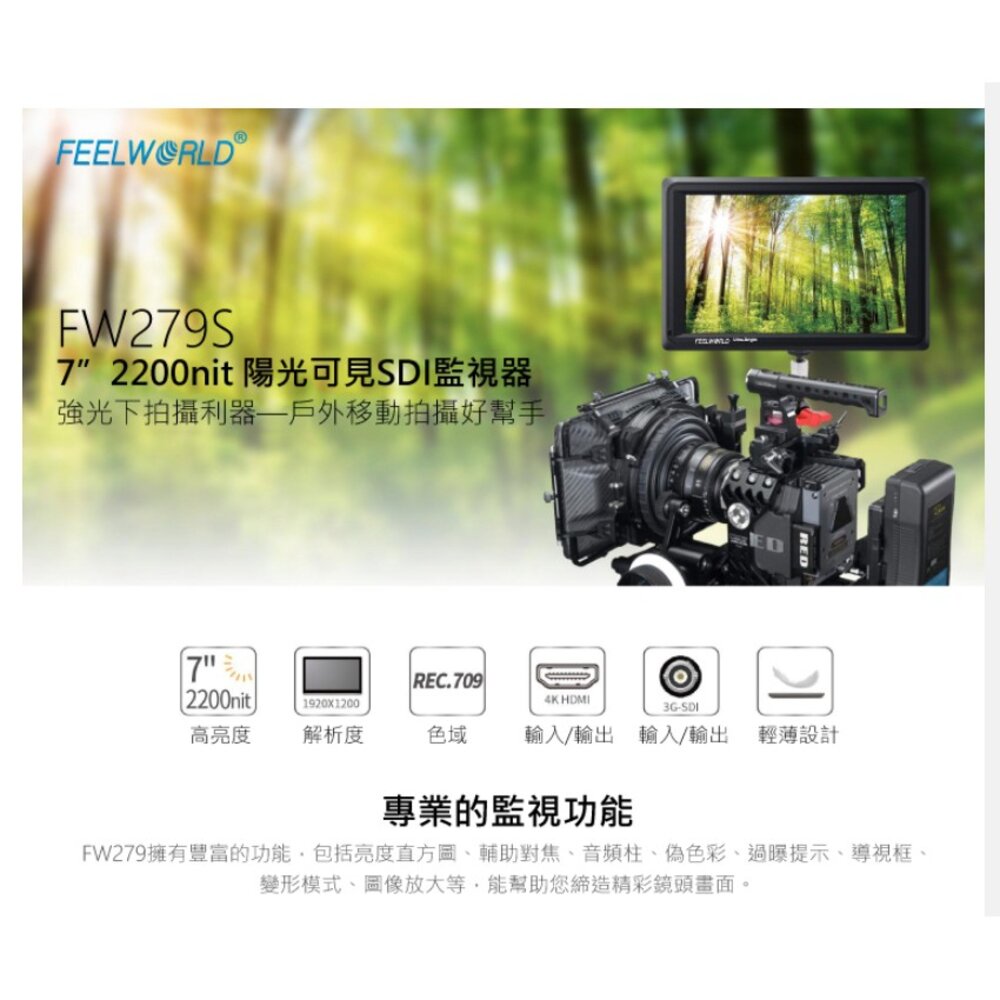 【FEELWORLD 富威德】FW279S 7吋IPS攝影監視螢幕,擁有2200nit高亮度、160度寬視角、1200:1高對比度、3G-SDI輸入/輸出、4K HDMI輸入/輸出,並且擁有多種攝影功能,包括直方圖、峰值輔助對焦、音頻柱曝光提示、偽色彩、放大、構圖輔助線、點對點、變形模式、圖像凍結等。
