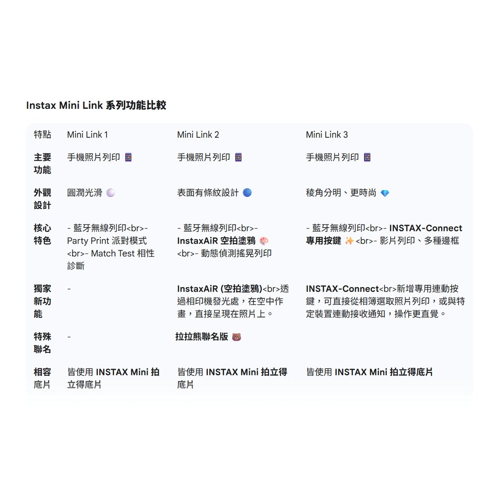 Mini Link 3 ✨:最新的旗艦款,除了具備所有基礎功能,還新增了INSTAX-Connect 專用按鍵,讓操作更加直覺快速。如果您追求最新科技、更時尚的外觀,或喜歡拉拉熊聯名版,Link 3 會是您的首選。