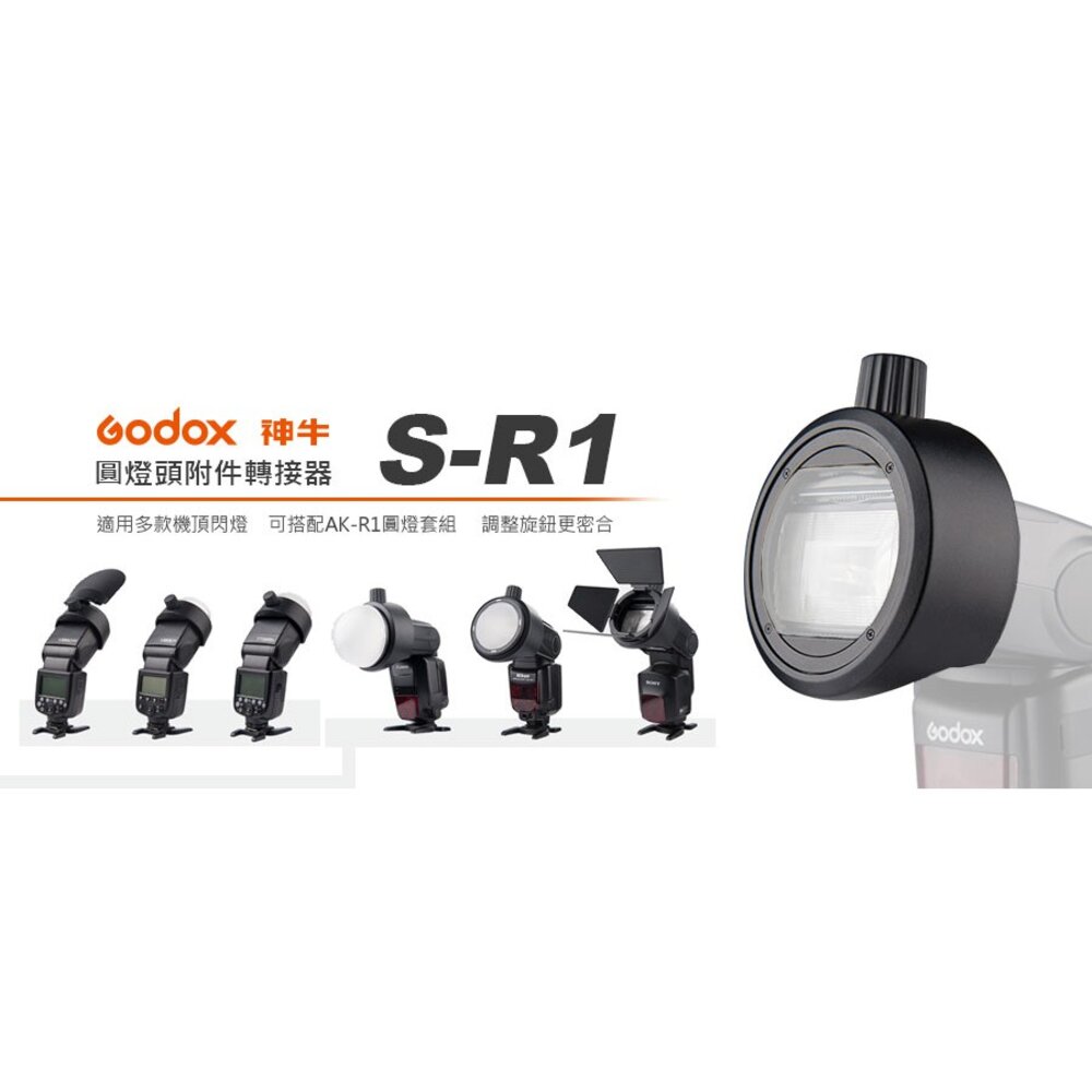 【光影變幻 ‧ 一秒轉接】 Godox S-R1 是一款專為方形機頂閃光燈設計的圓形燈頭附件轉接器。採用堅固的緊固旋鈕設計,能迅速將各品牌機頂閃燈轉為圓形接口,完美相容 AK-R1 系列磁吸配件(如半圓擴散球、色片、蜂巢等),讓光線分布更均勻柔和,輕鬆實現專業創意布光。