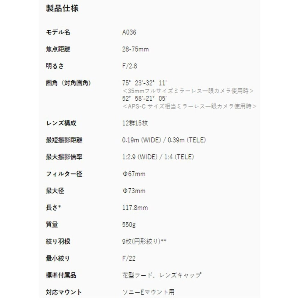 型號:A036 接環:Sony E-mount (全幅) 焦距:28-75mm 最大光圈:F/2.8 最近對焦距離:19cm (廣角) / 39cm (望遠) 濾鏡尺寸:67mm 重量:550g 貨源:平行輸入 (平輸店保)